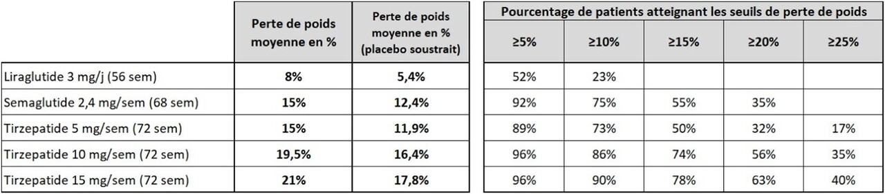 Enfin, l’inefficacité pondérale des TMO est définie comme une absence de perte de poids significative (< 5 %) après traitement d’un an à la dose maximale tolérée. Dans les essais randomisés de référence pour les 3 molécules disponibles, les taux d’inefficacité sont respectivement de 48,2 % sous liraglutide 3 mg/j, 7,6 % sous sémaglutide 2,4 mg/semaine et 3,7 % sous tirzépatide 15 mg/semaine.