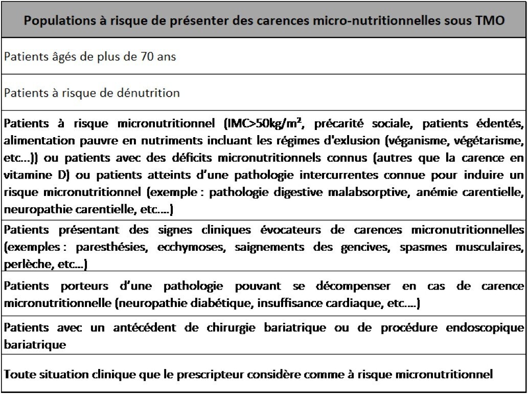 Après l’introduction du TMO, certaines situations à risque justifient le dépistage d’une carence micronutritionnelle (en utilisant le bilan sanguin ci-dessus) :
