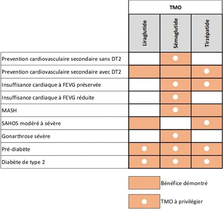 Le groupe de travail propose de privilégier la prescription de certains TMO en fonction du phénotype du patient (insuffisance cardiaque, MASH, diabète de type 2, etc.), afin de traiter les complications de l’obésité. Ces recommandations, basées sur l’état des connaissances en 2025 et donc susceptibles d’évoluer, sont résumées dans la figure 4.