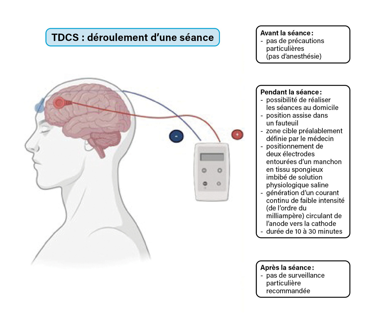 Comparativement aux autres techniques de stimulation, la TDCS présente l’intérêt d’être de faible coût économique et de pouvoir être réalisée à domicile grâce à des dispositifs portatifs. Le déroulement d’une séance de TDCS est décrit dans la figure 3.