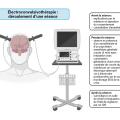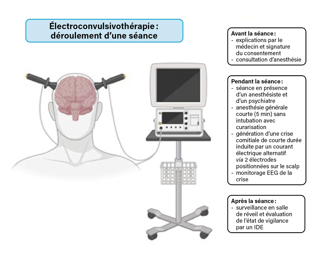 La séance est monitorée par un électroencéphalogramme permettant de contrôler la qualité de la crise. Le déroulement d’une séance d’ECT est décrit dans la figure 1.