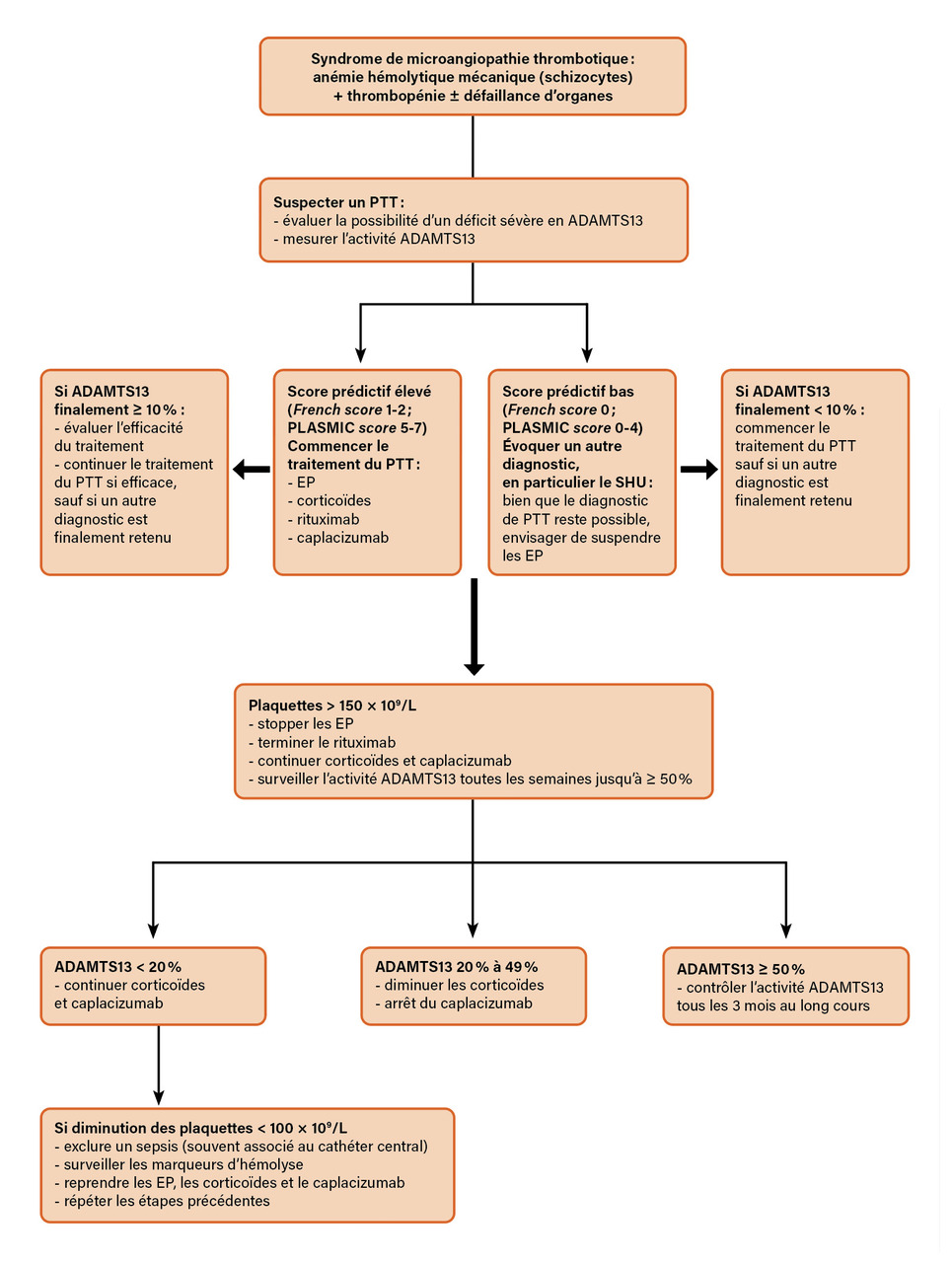 Le traitement du PTT est une urgence. Le résultat du dosage d’ADAMTS13 étant fréquemment obtenu après un délai de quelques jours, le traitement doit être initié de façon probabiliste. Des scores diagnostiques ont été proposés afin d’estimer la probabilité clinique de PTT et d’aider à la décision thérapeutique ; les plus utilisés sont le French score et le PLASMIC score (tableau 2).2