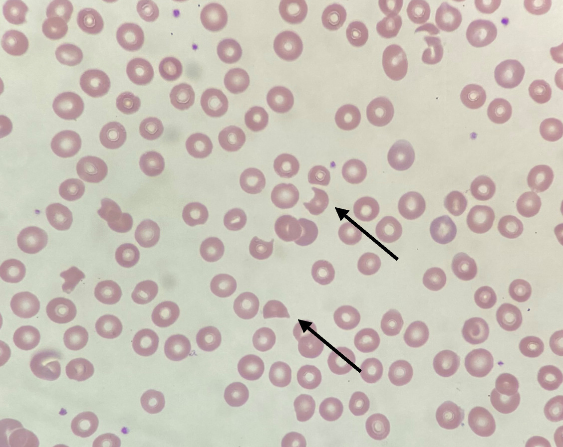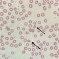 La thrombopénie est généralement profonde (inférieure à 30.109/L) ; l’anémie est régénérative ; elle s’accompagne d’une élévation des enzymes lactate déshydrogénase (LDH) [traduisant surtout les souffrances d’organes] et de la bilirubine libre, ainsi que d’un taux d’haptoglobine généralement bas ou indosable, témoignant de l’hémolyse. La présence de schizocytes au frottis sanguin signe le caractère mécanique de l’anémie hémolytique (fig. 2). Leur apparition est parfois tardive et doit justifier une recherche répétée quand ils sont absents initialement, alors que le reste du tableau clinico-biologique est évocateur. Le test direct à l’antiglobuline est classiquement négatif. Des anticorps antinucléaires, le plus souvent à faible titre, peuvent s’observer chez près de la moitié des patients et témoignent indirectement du caractère auto-immun de la maladie.