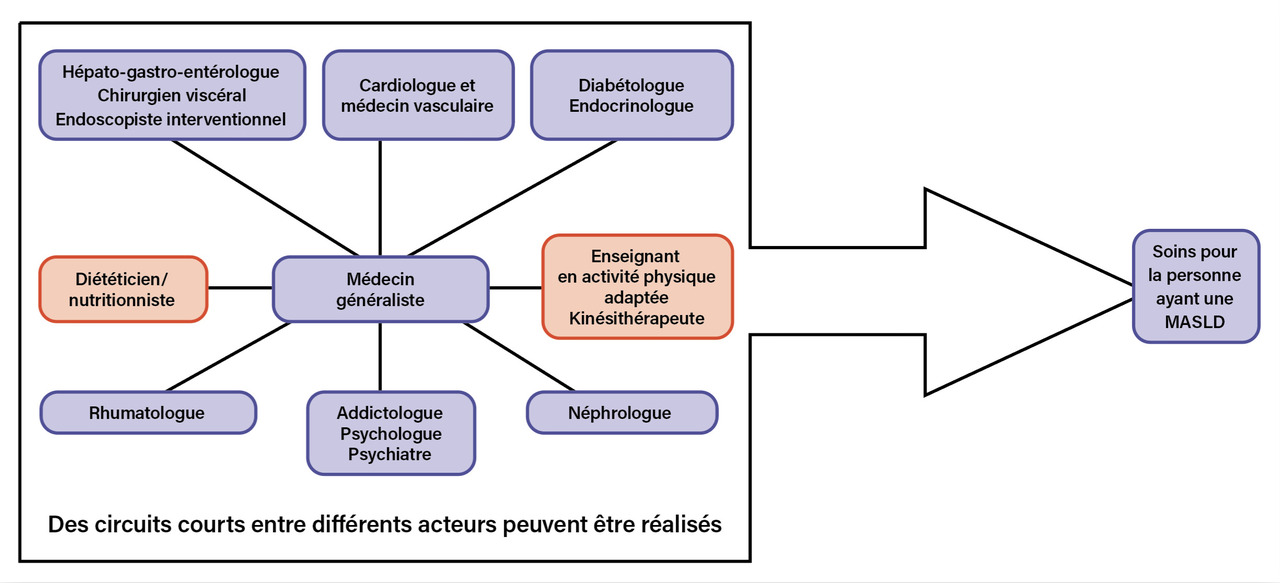 La figure 1 illustre les différentes approches thérapeutiques pour une personne ayant une MASLD selon la sévérité de la fibrose hépatique évaluée à l’aide de tests non invasifs (sériques ou physiques). Compte tenu de la grande fréquence de la MASLD (environ 11 % des femmes et 25,8 % des hommes en France métropolitaine), les médecins généralistes sont en première ligne pour repérer les personnes atteintes et réaliser une prise en charge globale, au long cours. Ils coordonnent les soins réalisés par les différents correspondants médicaux et paramédicaux (fig. 2). Les personnes avec une MASLD sans fibrose avancée (la majorité) doivent bénéficier d’une réévaluation de la fibrose hépatique par un ou deux test(s) non invasif(s) tous les deux à trois ans en l’absence de diabète de type 2, et tous les ans en cas de diabète de type 2. La reconnaissance des personnes avec une cirrhose liée à une metabolic dysfunction-associated steatohepatitis (MASH) ou avec une « fibrose avancée » (F3 -F4) selon les tests non invasifs est fondamentale car elle permet d’initier un suivi par un hépato-gastro-entérologue.4 Celui-ci dépiste le carcinome hépatocellulaire (CHC) par échographie abdominale et dosage sanguin de l’alphafœtoprotéine, et suit l’hypertension portale et la fonction hépatique, tous les six mois. L’apparition d’un CHC doit faire référer le patient dans un centre de recours habitué à prendre en charge cette complication. L’apparition de la première décompensation de la fonction hépatocytaire (score de Child-Pugh B ou C) doit faire adresser les patients de moins de 70 ans en centre de transplantation hépatique.