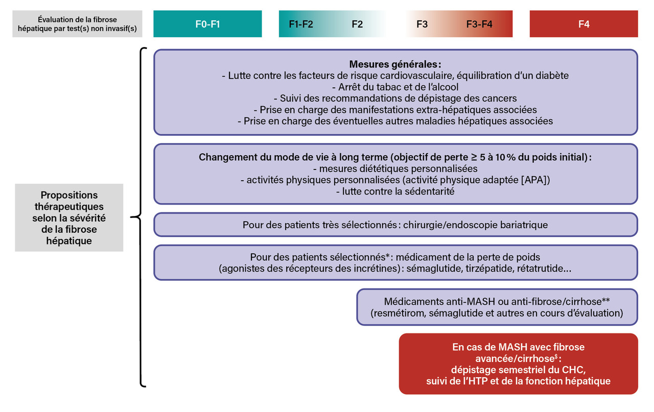 L’application des différentes approches thérapeutiques (fig. 1) peut nécessiter un rythme de suivi plus ou moins rapproché (trimestriel à annuel) afin d’entretenir la motivation de la personne ayant une MASLD et de suivre l’efficacité et la tolérance des thérapeutiques non médicamenteuses et médicamenteuses entreprises.
