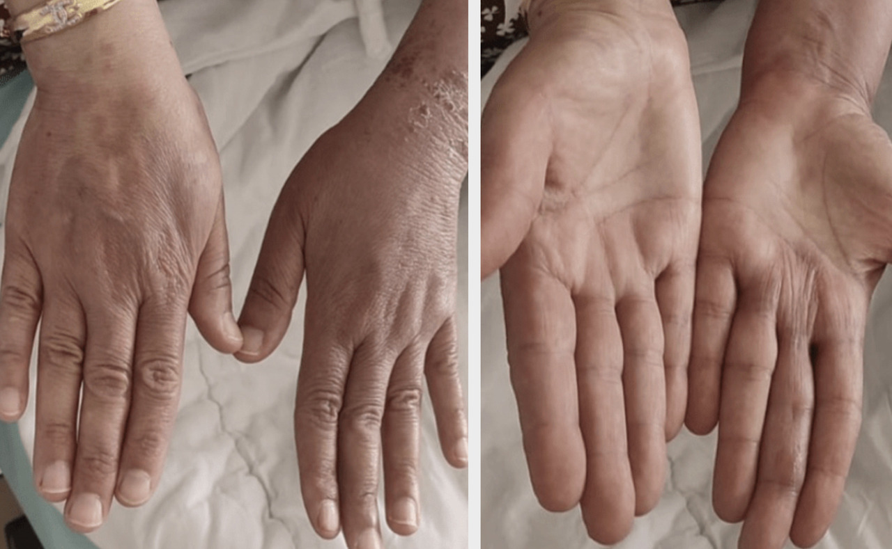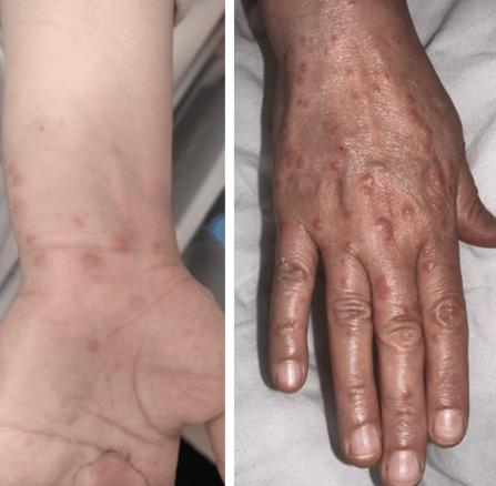 Le lendemain, la patiente développe un érythème prurigineux sur les deux mains, avec de multiples lésions érythémateuses maculopapuleuses de taille millimétrique, formant un aspect en rosette par endroits, sans atteinte des muqueuses et sans altération de l’état général (fig. 2). La patiente n’a pas signalé d’infection par le virus de l’herpès ou de symptômes pulmonaires récents.