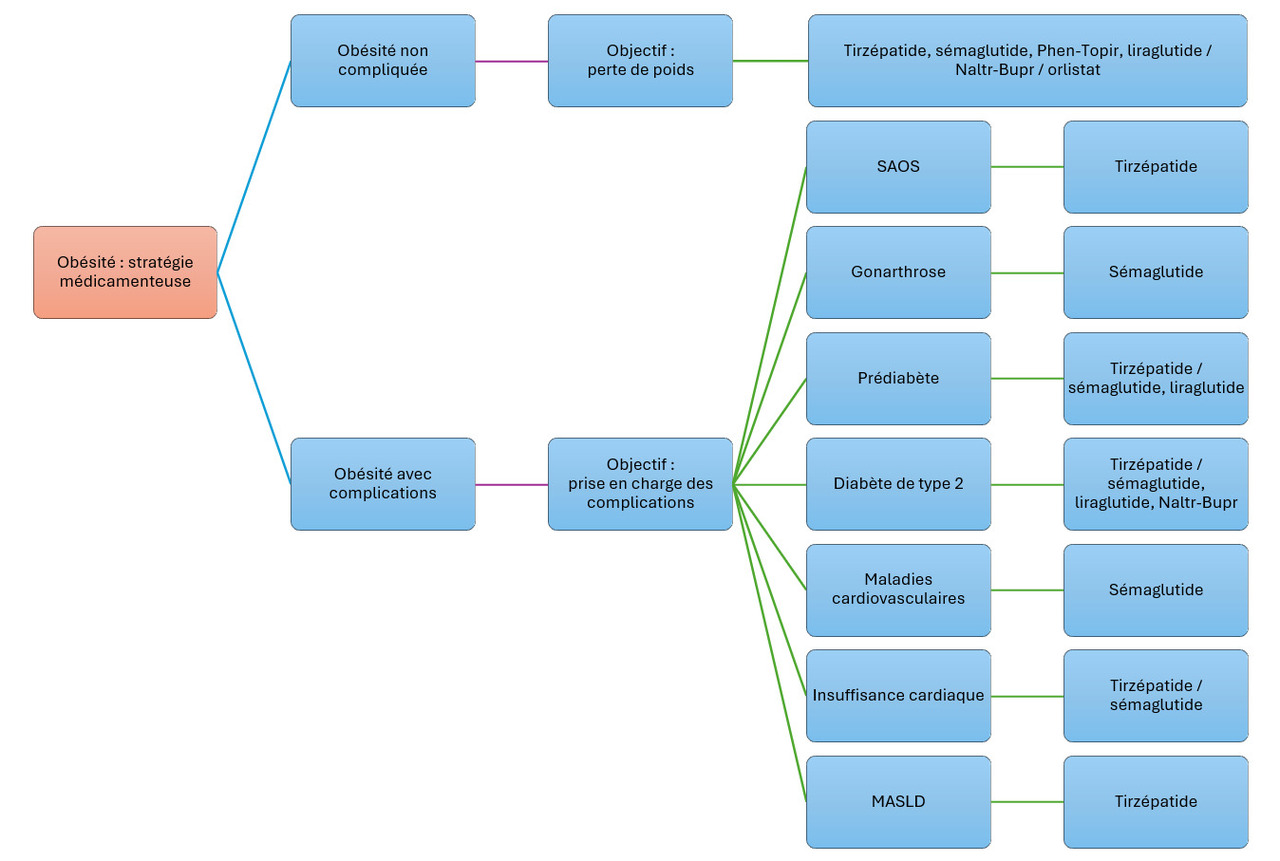 La synthèse de la position de l’EASO concernant les traitements médicamenteux recommandés dans l’obésité de l’adulte et ses complications est présentée dans la figure (algorithme) et le tableau 1 ci-joint. Globalement, dans l’obésité non compliquée (c’est-à-dire sans complications somatiques et/ou psychopathologiques associées), l’objectif étant la perte de poids, les experts indiquent que, sur la base de leur revue systématique avec méta-analyse, le tirzépatide et le sémaglutide devraient être considérés comme les médicaments de choix après prise en charge non médicamenteuse.