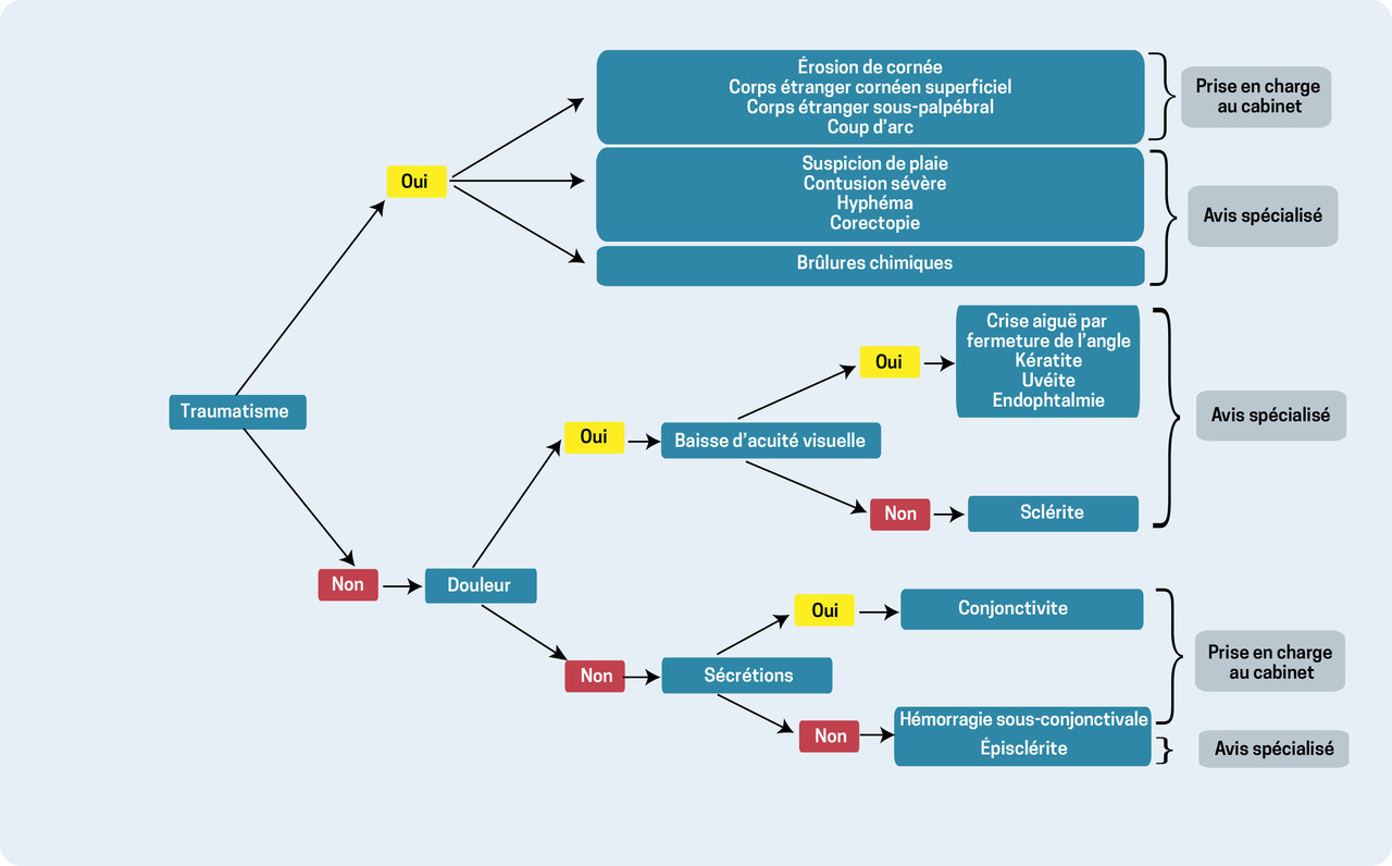 Chez les patients monophtalmes (un seul œil fonctionnel) ayant un œil rouge douloureux et/ou une BAV brutale, il ne faut pas laisser un doute diagnostique retarder la prise en charge.