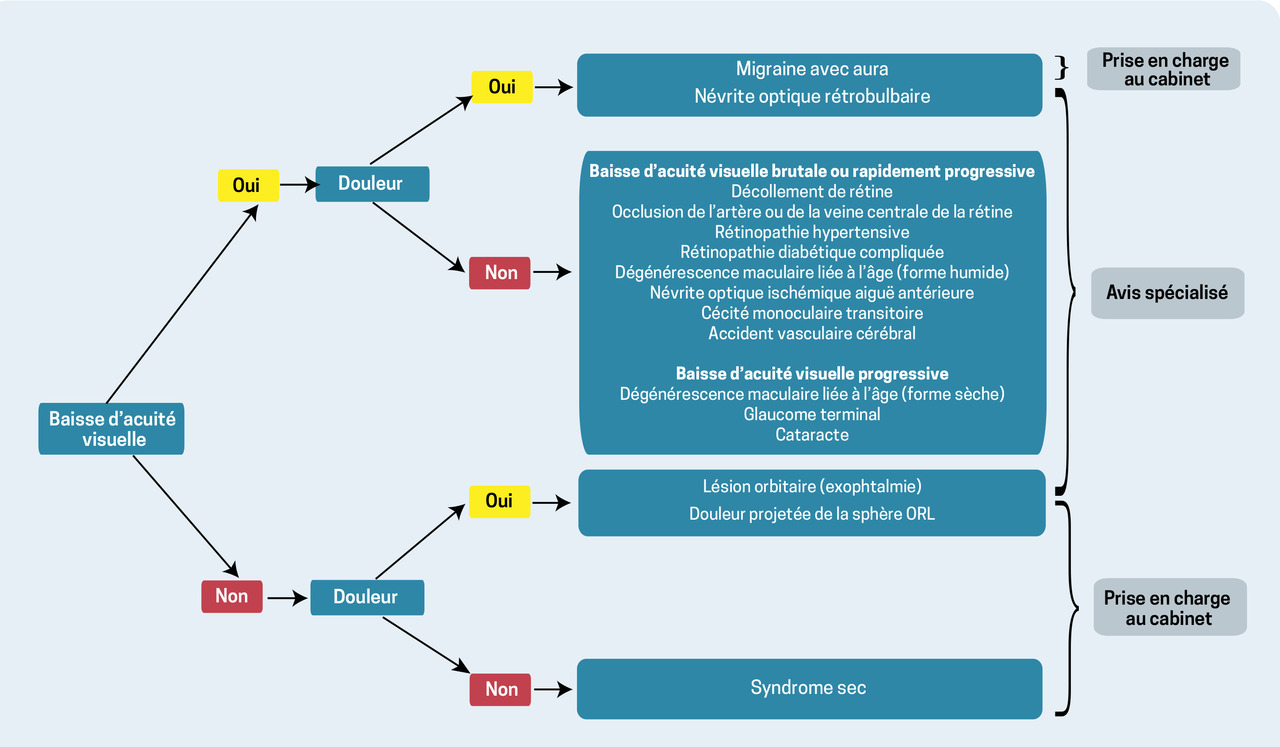 En cas de baisse d’acuité visuelle, plusieurs diagnostics sont à évoquer :