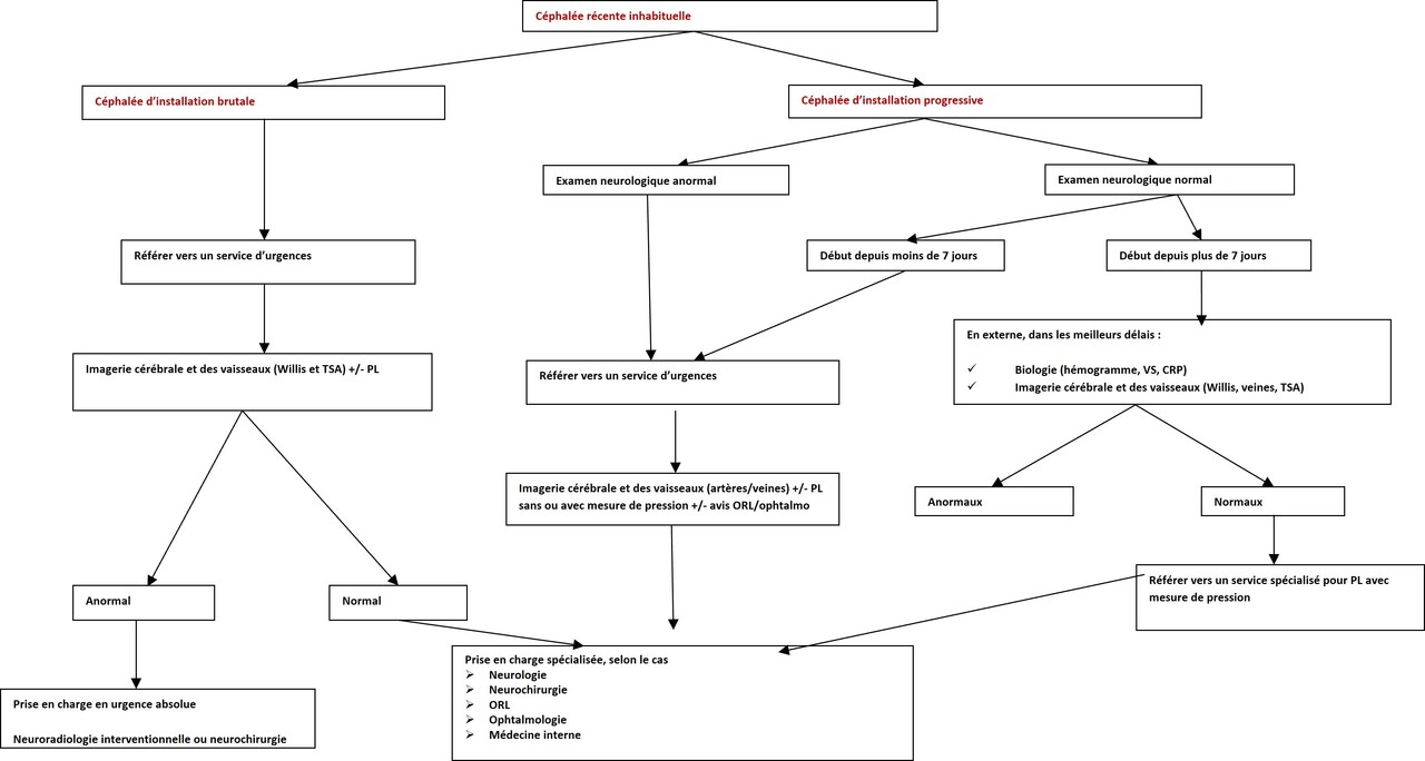 En revanche, toute céphalée récente, inhabituelle et tout changement de caractère, de localisation ou de durée d’une céphalée habituelle, doivent être considérées comme des céphalées secondaires jusqu’à preuve du contraire et nécessitent la réalisation d’un bilan complémentaire en urgence (encadré).