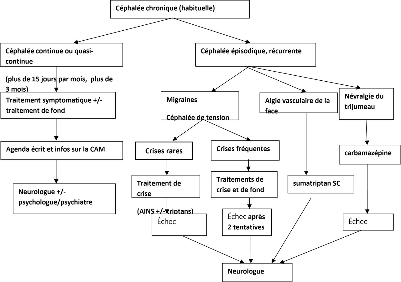 Compte tenu de la fréquence élevée des céphalées dans la population générale, le médecin généraliste est souvent le premier praticien consulté. Il est donc important qu’il soit en mesure de débuter une prise en charge adaptée (fig. 3) ou d’orienter le patient vers un service d’urgences ou vers un neurologue, selon le cas.