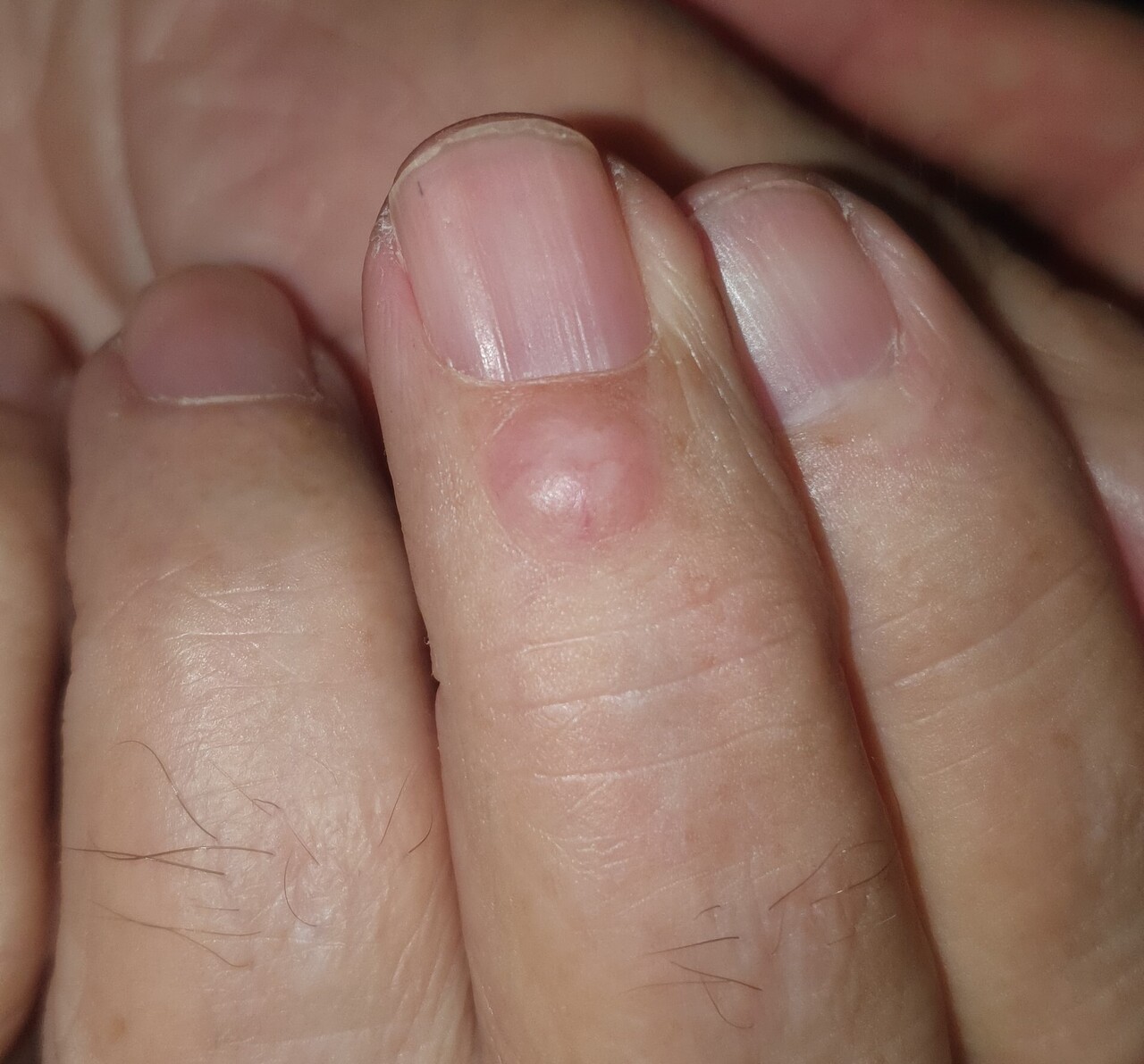 Cliniquement, il excède rarement les 20 mm de diamètre et peut prendre plusieurs formes : ombiliquée, bombée, voire plane dans certains cas. La surface de cette tuméfaction est généralement translucide du fait de l’amincissement de la peau à ce niveau. Le pseudokyste mucoïde est asymptomatique mais la tablette unguéale peut se déformer sous sa pression. Parfois, il peut se fistuliser et engendrer une infection secondaire.