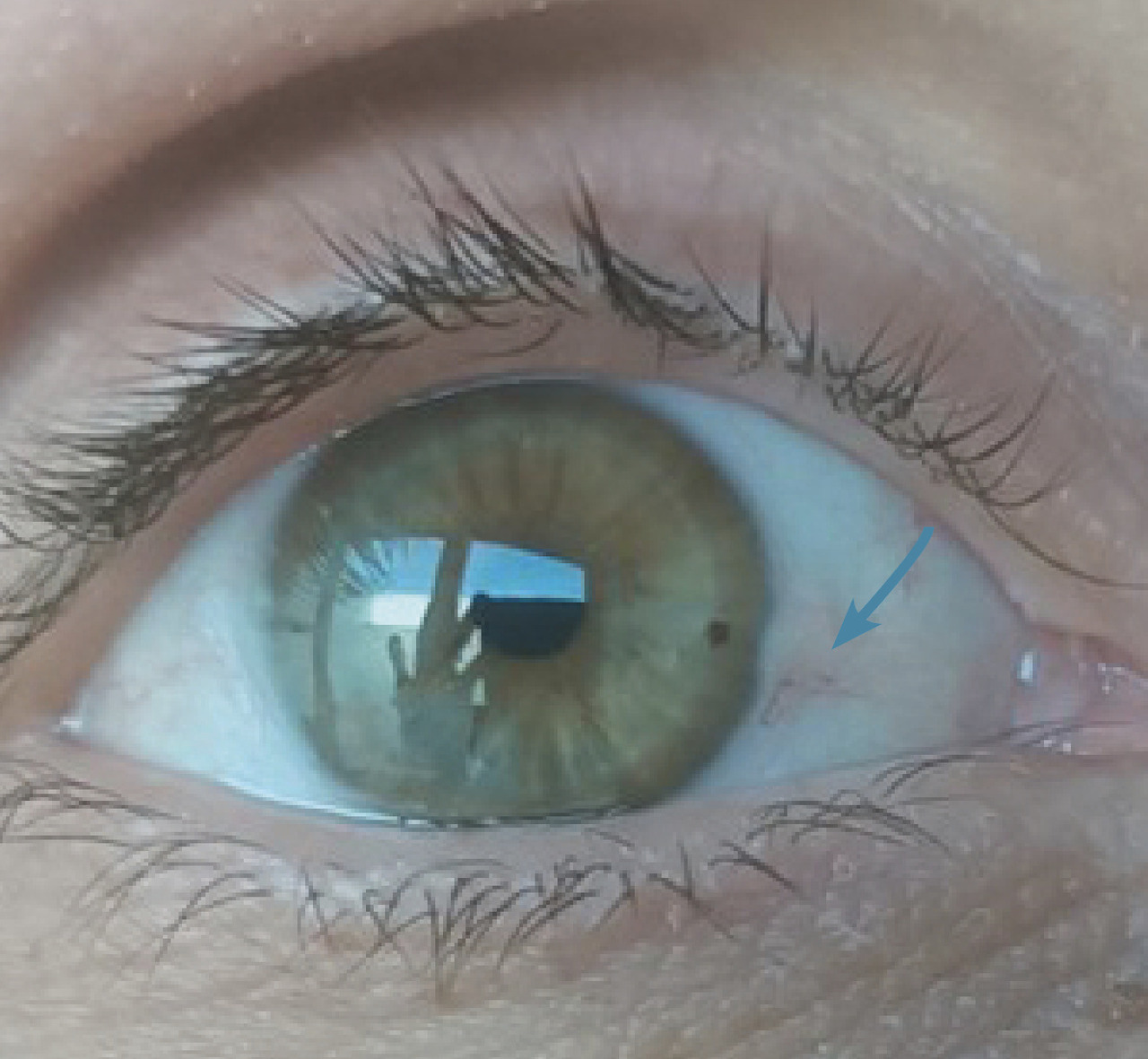 L’examen clinique retrouve un œil blanc, douloureux, avec une gêne à type de prurit et un épaississement de la cornée (figure). Il n’y a pas de baisse de l’acuité visuelle ou d’amputation du champ visuel. Il n’y a pas de corps étranger visible.
