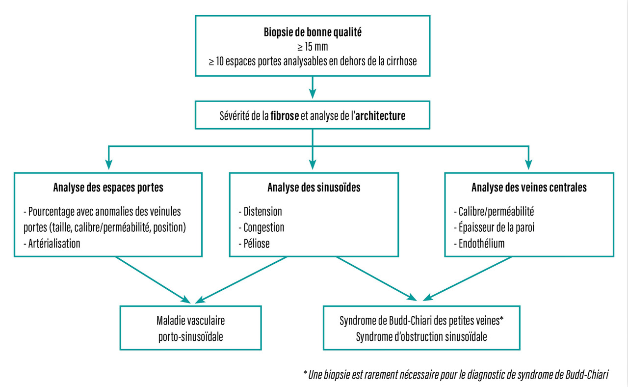 Dans ce contexte, le pathologiste a une place prépondérante pour le diagnostic de la maladie vasculaire. Il doit analyser pas à pas la biopsie en portant une attention toute particulière aux vaisseaux. Tout d’abord, une biopsie de suffisamment bonne qualité est nécessaire pour établir le diagnostic de maladie vasculaire. Cette biopsie doit mesurer au moins 15 mm et, en dehors de la cirrhose, au moins dix espaces porte complets sont nécessaires pour considérer le prélèvement comme de qualité suffisante.10 Outre l’identification des caractéristiques morphologiques élémentaires suggérant des anomalies vasculaires, l’analyse de la biopsie hépatique permet d’estimer l’étendue de ces anomalies et leur chronicité grâce à l’évaluation de la fibrose et des distorsions architecturales.11