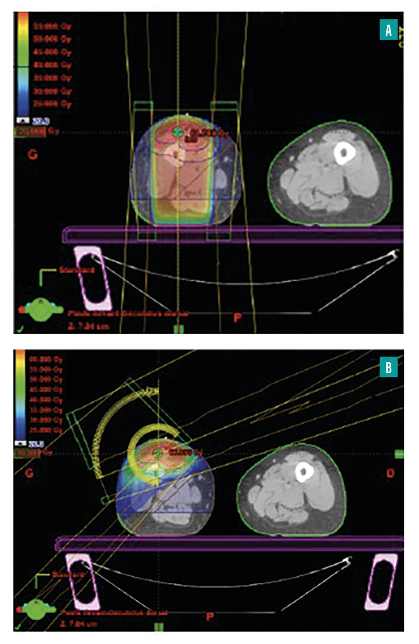 Classiquement, la radiothérapie des sarcomes des membres utilisait deux faisceaux d’irradiation opposés en forme de tunnel qui couvraient l’ensemble du volume cible avec d’importantes marges de sécurité, entraînant une irradiation de l’ensemble des compartiments musculaires du membre. De ce fait, il était difficile, d’une part, de protéger les organes à risque, comme la peau et l’os, et, d’autre part, d’apporter une irradiation homogène sur des volumes complexes et irréguliers avec d’importantes différences d’épaisseur par zone (fig. A).