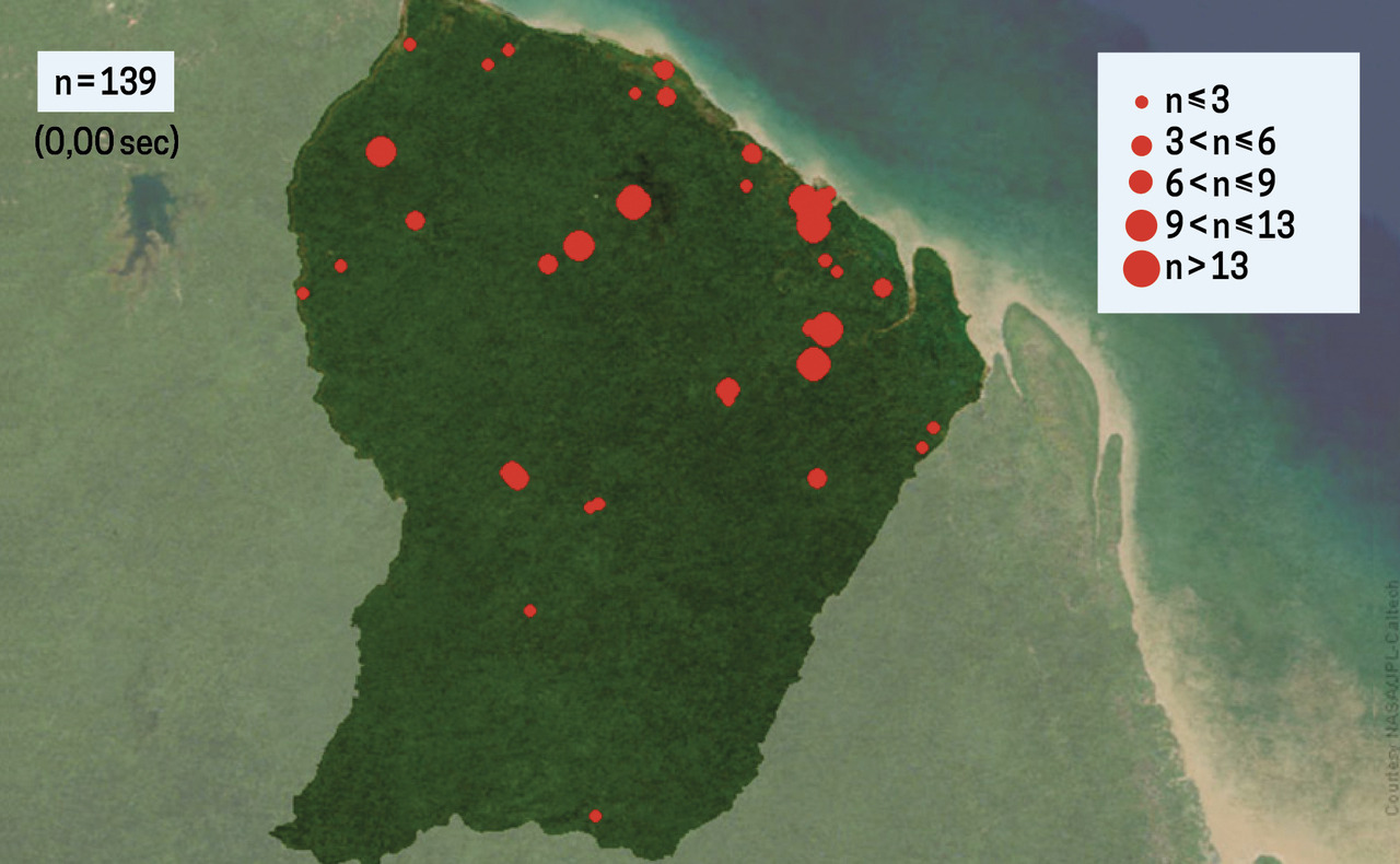 En Guyane, le chien est le « mordeur » principal, suivi par les chauves-souris.3,4 Ces dernières constituent le principal réservoir du virus de la rage en Guyane. Sur les 108 espèces présentes sur l’ensemble du territoire, y compris le littoral (fig. 1), deux sont hématophages (vampires), mais seul Desmodus rotundus (vampire commun) est responsable de morsures humaines. Cette chauve-souris s’attaque également à d’autres mammifères (chiens, chats, singes, etc.), qui deviennent à leur tour vecteurs du virus.