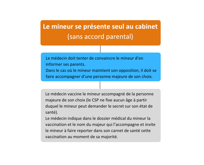Dans ce cadre des vaccinations recommandées, le Cnom indique aussi la possibilité d’impliquer dans la décision l’enfant, s’il est « mature » en matière de santé, c’est-à-dire capable de comprendre et de participer aux décisions médicales qui le concernent (bien que l’âge ne soit pas précisé, il s’agit généralement d’un adolescent de plus de 12 - 13 ans). Si le mineur souhaite se faire vacciner mais que les parents s’y opposent, Il est tenu de choisir un majeur référent qui l’accompagne au cours de sa prise en charge (article L. 1111 - 5 du CSP). Une vaccination confidentielle est possible dans certains cas limités (ex : HPV, etc.), « si l’enfant est jugé mature et autonome » (article L. 1110 - 4 du CSP).