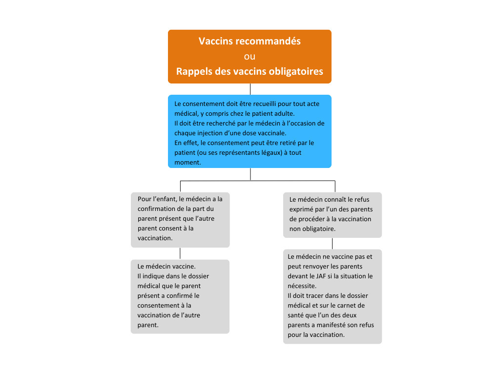 La vaccination recommandée n’étant pas considérée comme un acte usuel, il est impératif d’obtenir l’autorisation des deux parents, y compris en cas de séparation. Le médecin doit donc s’assurer qu’il n’y a pas d’opposition de la part de l’autre parent. S’il administre le vaccin recommandé en connaissance du refus, il commet une faute déontologique et sa responsabilité pénale pourra être éventuellement engagée. Lemédecin doit, le cas échéant, inscrire dans le carnet de santé et le dossier médical de l’enfant le refus des deux parents.