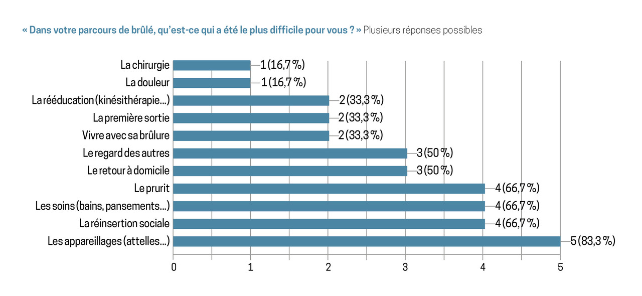 - Les six patients ayant répondu étaient adultes (5 avaient été brûlés dans l’enfance). En moyenne, ils vivent avec leur brûlure depuis dix-huit ans (de 3 à 31 ans), la surface cutanée brûlée variant de 28 à 97 %. Tous étaient passés par un centre de rééducation et ont bénéficié d’un suivi multidisciplinaire. Ce qui a été le plus difficile à vivre pour eux (plusieurs réponses possibles) était : les appareillages, la réinsertion psychosociale, les soins, le prurit, le regard des autres, le retour à domicile, la rééducation, la première sortie et la vie avec la brûlure, la chirurgie et la douleur (fig. 1). Pour 5 patients sur 6, l’appareillage était le domaine le plus difficile à gérer lors de leur parcours de brûlure.L’appareillage a, en effet, une forte influence sur le regard des autres et donc sur la réinsertion psychosociale.