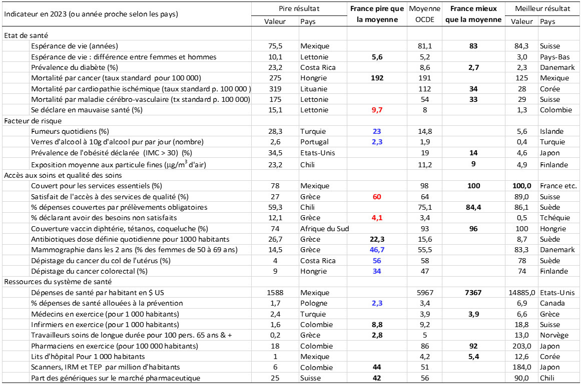 Le Panorama de la santé comprend un document de 241 pages ainsi qu’un résumé de 8 pages pour la France. On y trouve de très nombreuses données permettant de situer la France par rapport à la moyenne des 38 pays de l’OCDE pour une liste d’indicateurs essentiels. Le document est remarquablement bien fait et toutes les données sont accessibles. Il est impossible de décrire la masse de données, on ne peut qu’en extraire les points les plus saillants.