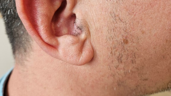 Un homme de 45 ans est vu en consultation pour un bilan de routine. Il ne prend aucun traitement et ne rapporte aucun symptôme. Il a pour seul antécédent un tabagisme sevré depuis cinq ans. À l’examen clinique, un sillon diagonal est observé au niveau de chaque lobe d’oreille, mais plus marqué à droite (figure). L’aspect évoque un signe de Frank, qui n’existait pas auparavant. Un avis cardiologique est sollicité ; le bilan initial (électrocardiogramme et échographie cardiaque) est normal. Une scintigraphie myocardique réalisée secondairement met en évidence des lésions tritronculaires ayant nécessité un pontage.