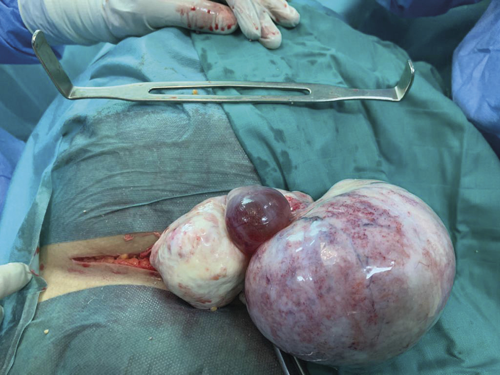 L’examen histopathologique a révélé un fibrothécome ovarien. L’ensemble des biopsies et la cytologie péritonéale étaient indemnes de malignité.