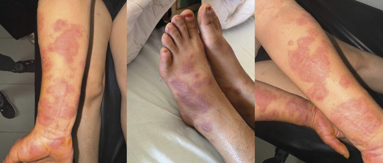 Une patiente âgée de 42 ans – ayant comme antécédents des angines à répétition à raison de six épisodes par an – est admise au sein du service de dermatologie pour des plaques érythémateuses non prurigineuses apparues vingt-cinq jours auparavant, rapidement évolutives, avec une toux et des expectorations blanchâtres, ainsi qu’une fièvre à 39 °C.