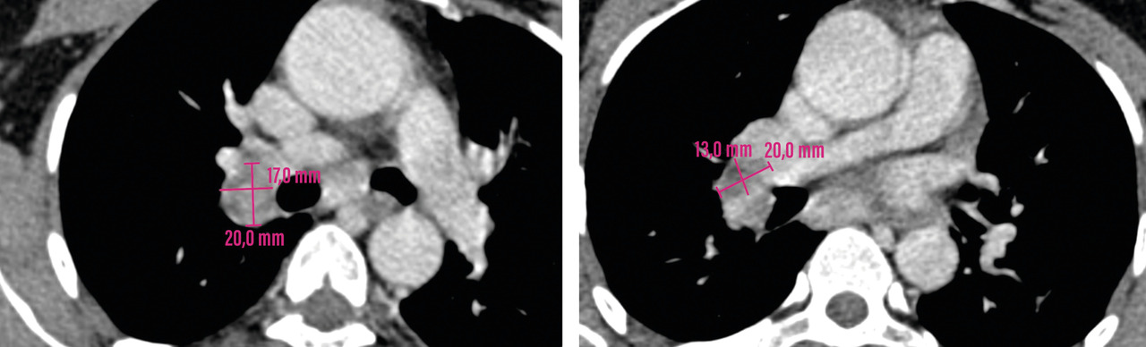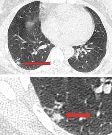 Un scanner cervico-thoraco-abdomino-pelvien est réalisé, à la recherche de signes radiologiques d’une pathologie associée. Il montre des adénopathies médiastino-hilaires droites, nécrotiques (fig. 2) et un foyer de micronodules parenchymateux pulmonaires lobaires inférieurs droits, confluents, avec un nodule central, réalisant le signe de la galaxie, visible sur une tomodensitométrie axiale du thorax (fig. 3). Ces signes sont-ils ceux d’une sarcoïdose pulmonaire active ou d’une atteinte granulomateuse de type tuberculose ou d’une autre cause ?