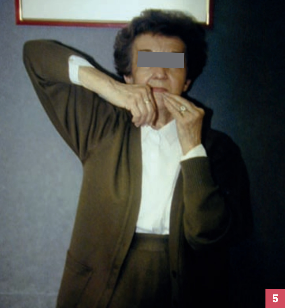 - évidente : épaule pseudoparalytique avec impossibilité de lever le bras contre la pesanteur (fig. 4). Prédominant sur les rotateurs externes avec difficulté pour se raser, se coiffer si c’est le bras dominant qui est concerné. Au maximum c’est le signe du clairon (fig. 5) par impossibilité d’effectuer une rotation externe active, alors que l’élévation active reste possible. Il impose au patient de lever le coude plus haut que la main pour mettre cette dernière à la bouche ;