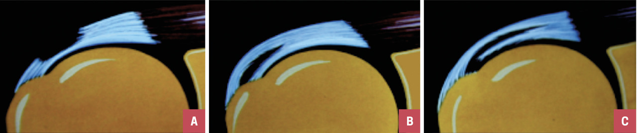On distingue différentes lésions tendineuses : non rompues, on parle alors de tendinopathies ; ou rompues, la rupture pouvant être partielle ou transfixiante (fig. 2 et 3).