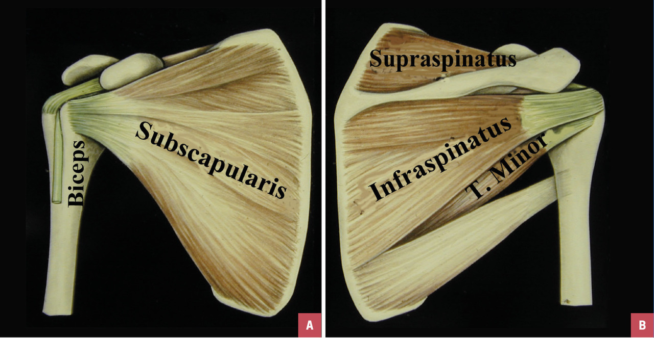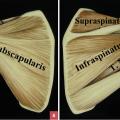 Pour rappel, la coiffe des rotateurs est un manchon musculotendineux situé dans l’espace sous-acromial, venant de l’omoplate vers les tubérosités humérales et recouvrant la tête de l’humérus. Les 5 tendons concernés sont (d’avant en arrière, fig. 1) : le sous-scapulaire (sub-scapularis), la longue portion du biceps brachial (biceps brachii), le sus-épineux (supra spinatus), le sous-épineux (infra spinatus) et le petit rond (teres minor).