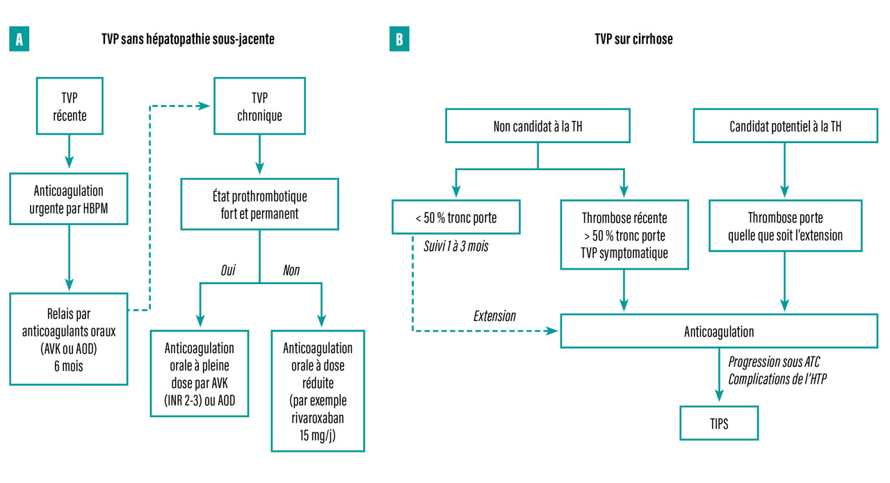 En cas de TVP récente, le traitement anticoagulant doit être introduit en urgence. Il permet de prévenir l’extension du thrombus et de diminuer le risque d’ischémie et d’infarctus mésentérique.3 La reperméabilisation spontanée sans anticoagulants est exceptionnelle. L’administration précoce des anticoagulants (dans les vingt-quatre heures après le diagnostic radiologique) est un facteur associé à la reperméabilisation complète de la veine porte.9