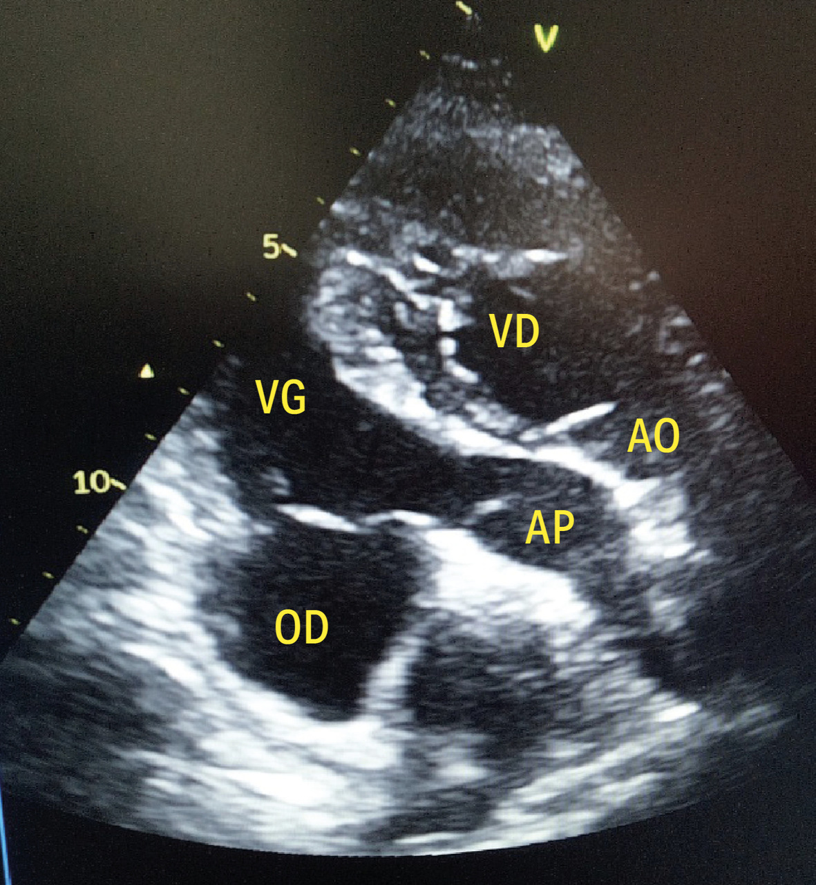 Un homme de 39 ans consulte pour une dyspnée d’effort apparue progressivement et des palpitations intermittentes. L’examen clinique est normal. L’électrocardiogramme montre un PR allongé. L’échocardiographie transthoracique révèle une discordance atrioventriculaire et ventriculo‑artérielle, compatible avec une transposition des gros vaisseaux congénitalement corrigée : l’aorte naît du ventricule droit morphologique, tandis que l’artère pulmonaire émerge du ventricule gauche morphologique, suivant un trajet parallèle (figure). Du fait de l’absence d’anomalies valvulaires associées, un traitement médical symptomatique est instauré, avec une bonne évolution.