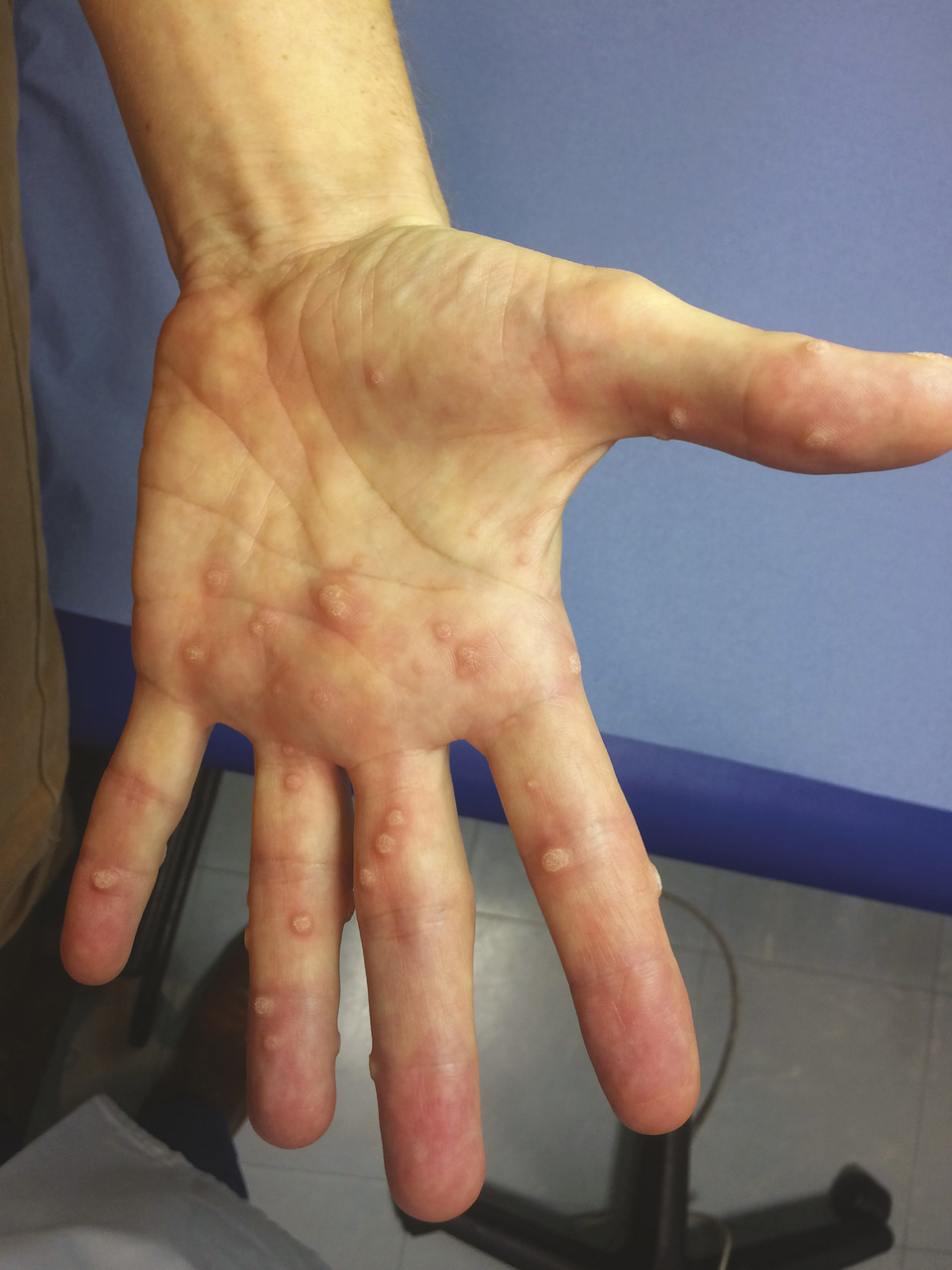 - vulgaires, affectant principalement les doigts, le dos des mains, mais également les sites traumatisés (coudes et genoux par effet dit Koebner) [fig. 1]. Associées aux génotypes 1, 2, 4, 27 et 57 des HPV, ces verrues ont un aspect en dôme et peuvent être uniques ou multiples, isolées ou coalescentes ;