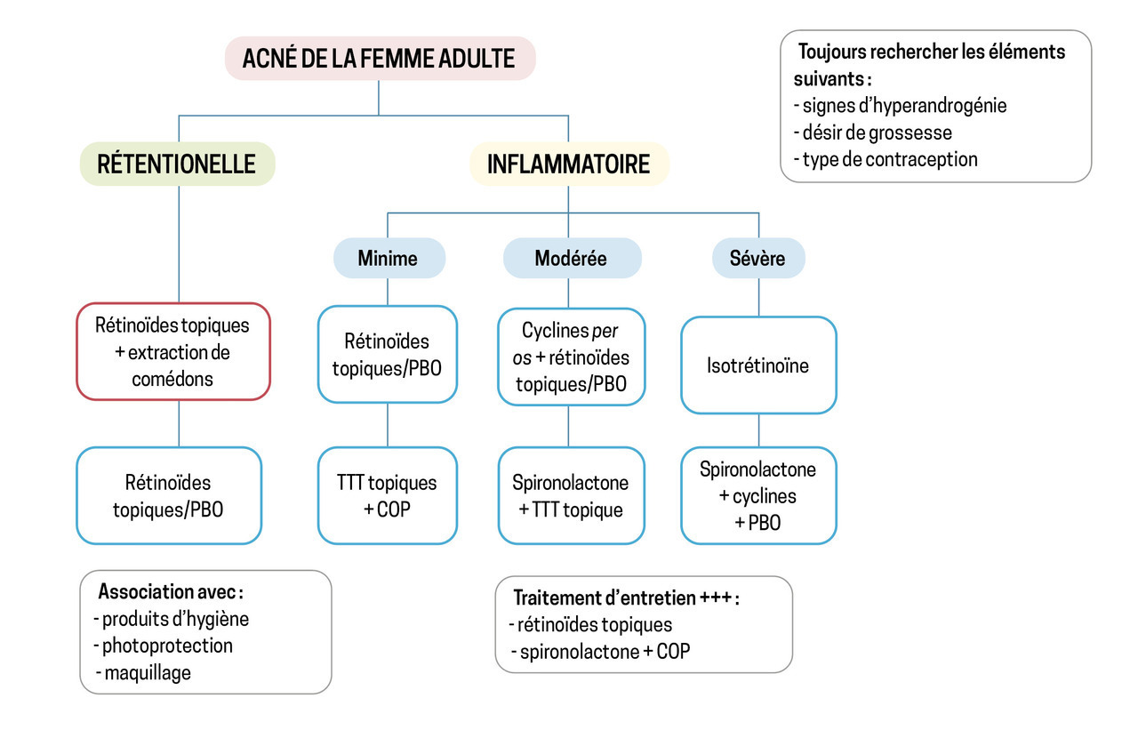 D’après : Ballanger-Desolneux F. Acné de l’adulte : une présentation différente de celle de l’adolescent. Rev Prat Med Gen 2026;40(1104);91-6.