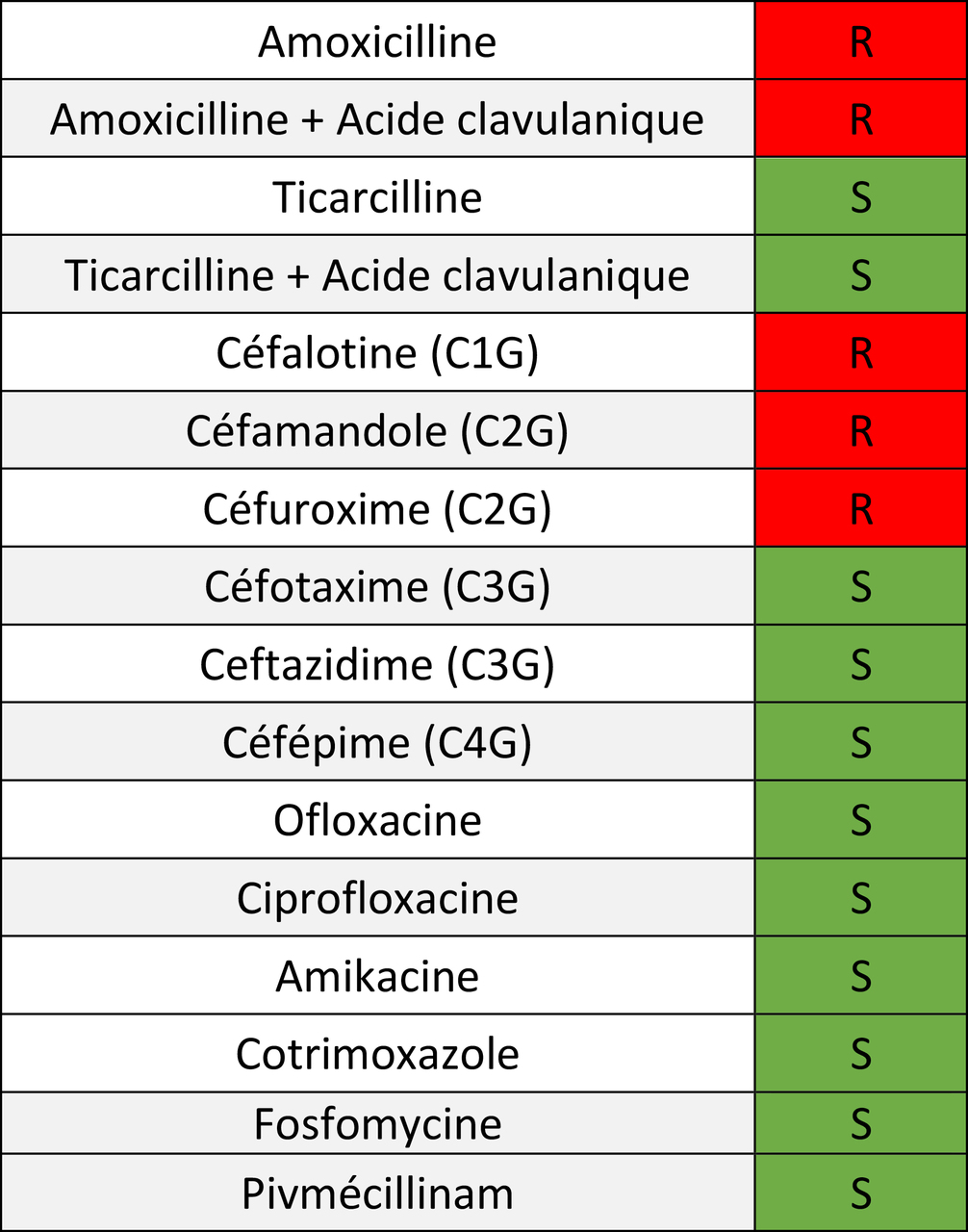 Vous prescrivez donc un dosage de β-hCG urinaire – qui revient positif. L’ECBU quant à lui revient positif (leucocyturie > 104/mL) à Citrobacter freundii (105 UFC/mL) dont voici l’antibiogramme.