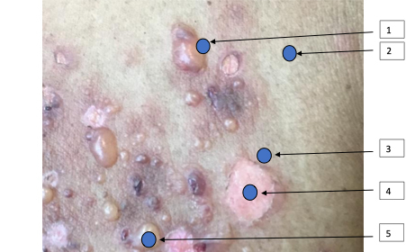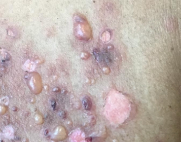 Plus rare, bulles sur zones de frottement, souvent cicatricielles.