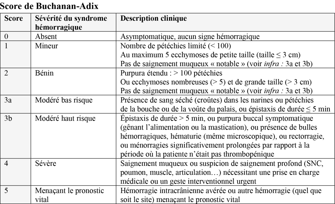 Si le score de Buchanan est entre 0 et 2 et les plaquettes sont supérieures au seuil de 10 000/mm3, une abstention thérapeutique se justifie sauf dans les cas suivants : antécédent récent de traumatisme, lésion susceptible de saigner, conditions géographiques ou socio-économiques d’accès aux soins précaires, enfant de moins de 1 an. En cas de saignement modéré (Buchanan = 3), il peut être proposé une corticothérapie per os (en association avec un antisécrétoire gastrique) ou une perfusion IV d’immunoglobulines polyvalentes. En cas d’hémorragies sévères et/ou prolongées (Buchanan à 4 ou 5, situations exceptionnelles chez l’enfant), le traitement doit associer en unité de soins intensifs/réanimation une perfusion IV d’immunoglobulines polyvalentes et une corticothérapie IV (bolus de méthylprednisolone à 15 mg/kg/j sur quatre à six heures sans dépasser 1 g/j, qui peut être répété à J2 et J3 ; ou de la dexaméthasone 0,6 mg/kg/j sans dépasser 40 mg/j en IV sur trente minutes, en 1 ou 2 injections par jour pendant quatre jours).