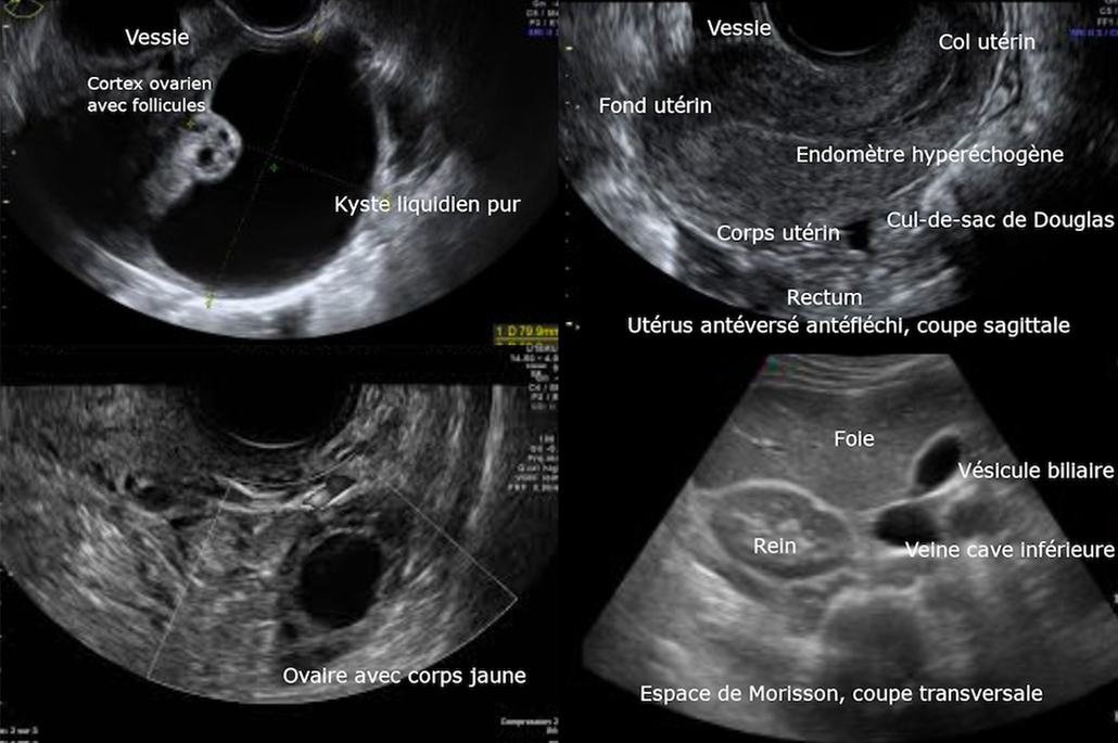 L’aspect anéchogène avec un renforcement hyperéchogène postérieur (les ultrasons n’ont pas été atténués par le liquide présent dans le kyste contrairement à ceux ayant traversé le reste des tissus) est en faveur de la présence de liquide à l’intérieur du kyste. Les kystes fonctionnels bénins sont justement liquidiens purs.