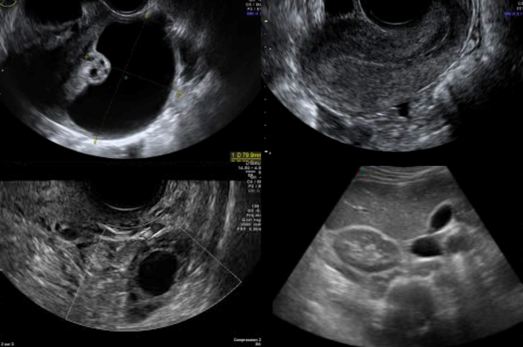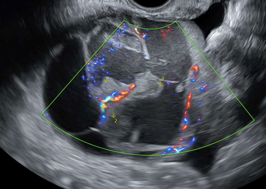 Une échographie pelvienne abdominale puis endovaginale est réalisée (figure 1). Elle montre :