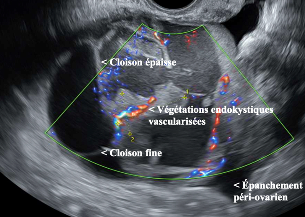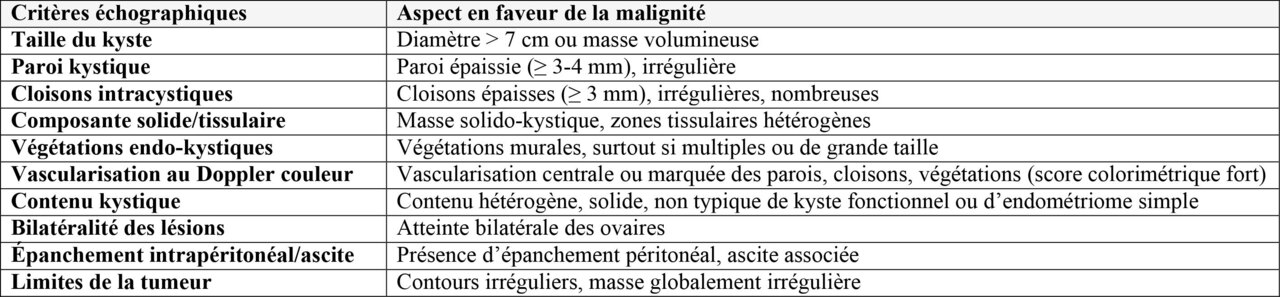 Les principaux critères échographiques en faveur de la malignité d’un kyste ovarien sont la présence de composantes solides (végétations, paroi/cloisons épaisses), la vascularisation Doppler suspecte, l’ascite et certains critères de taille et de bilatéralité.
