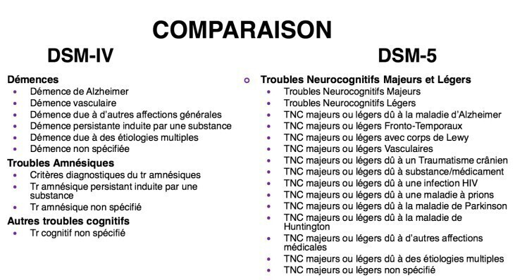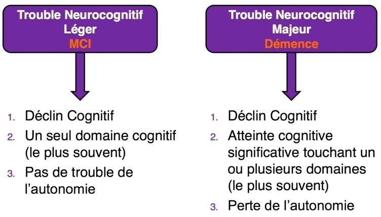 En résumé, les différences entre un trouble neurocognitif majeur (ex-démence) et un trouble neurocognitif mineur sont :