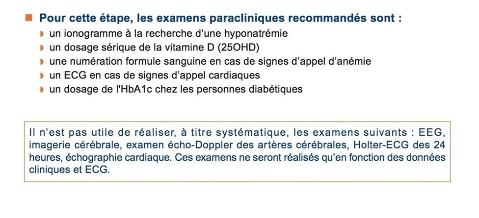 Ses antécédents sont marqués par une HTA traitée par amlodipine et ramipril, un diabète de type 2 évoluant depuis vingt ans, traité par metformine et gliclazide, une ostéoporose fracturaire diagnostiquée il y a un an et traitée par zolédronate et Cacit D3 et une polyarthrose traitée par du paracétamol, de l’Aspégic en prévention cardiovasculaire primaire et de l’oméprazole. Elle vous rapporte par ailleurs plusieurs épisodes de chute au cours des trois derniers mois. Elle vous donne également un bilan biologique d’il y a six mois qui retrouvait un DFG à 70 mL/min et une microalbuminurie à 44 mg/24 heures. Votre examen clinique retrouve un poids à 66 kg pour une taille à 1,67 m, une PA à 110/65 mmHg, FC à 64 bpm. Le reste de l’examen clinique est normal.