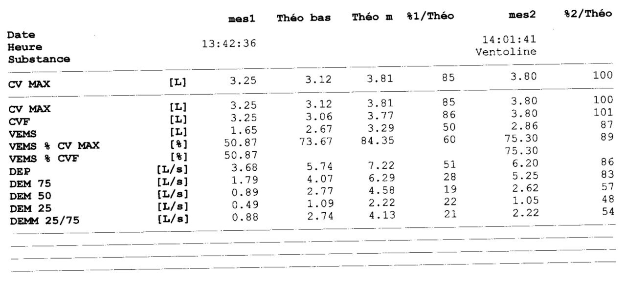 Gain > 200 mL et 12 % (ici gain de 1 210 mL, soit gain de 73 % de la valeur préventoline).