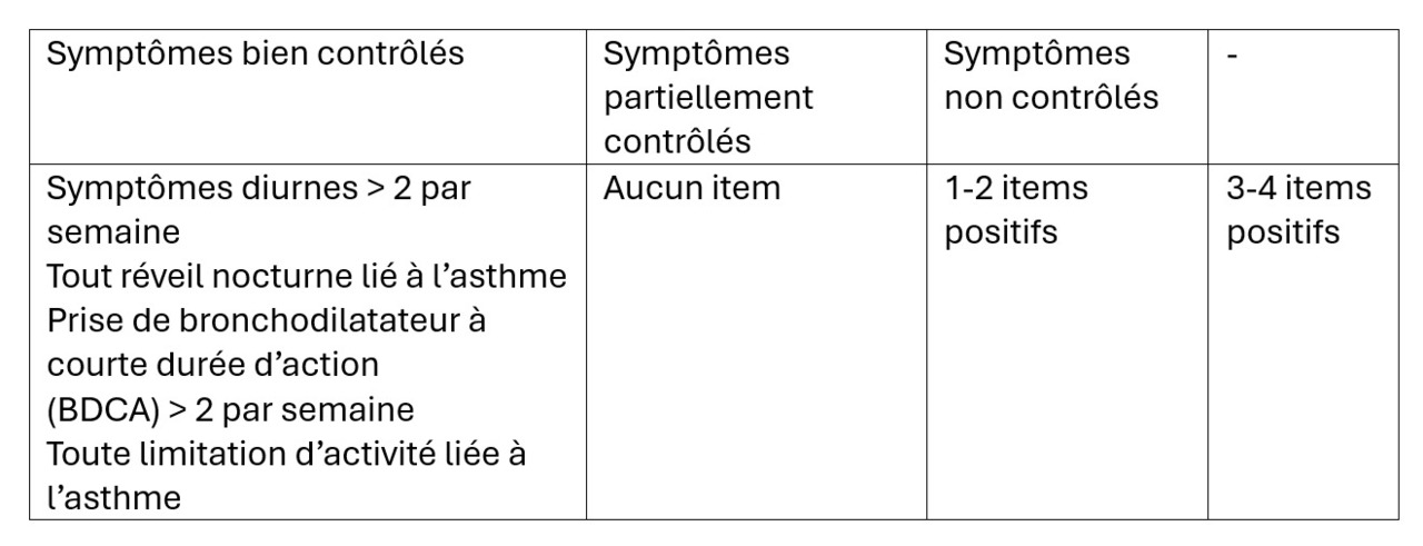 • les symptômes d’asthme sont contrôlés (évaluation par l’interrogatoire sur les 4 dernières semaines) [tableau suivant] ;