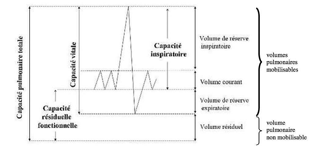 Une spirométrie simple permet de mesurer les volumes mobilisables par le patient au cours de manœuvres respiratoires, soit le volume expiré maximal par seconde (VEMS) et la capacité vitale (CV). Les volumes non mobilisables, le volume résiduel (VR), volume qui reste dans les poumons à la fin de l’expiration totale, et la capacité pulmonaire totale (CPT [CV + VR]), sont mesurés par dilution en pléthysmographie.