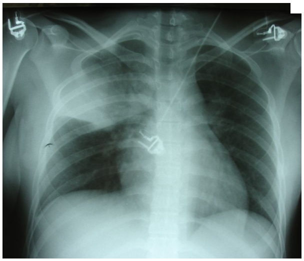 La patiente vous dit que depuis quelques jours elle est enrhumée et que depuis 24 heures elle se sent très fatiguée, essoufflée à l’effort et qu’elle tousse beaucoup. À l’entrée, la patiente a du mal à répondre aux questions. Elle est fébrile à 39 °C. Sa fréquence respiratoire (FR) est à 30/min et la fréquence cardiaque (FC) à 125 bpm. L’auscultation révèle des râles sibilants diffus et des râles crépitants apicaux droits. Le débit expiratoire de pointe est à 43 % de la théorique. La saturation artérielle en oxygène (SpO2) est à 88 %. La radiographie est la suivante. Figure 1.