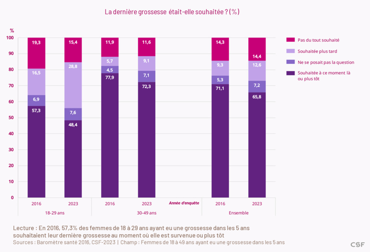 Comme indiqué dans le graphique ci-dessous, seulement 48,4 % des femmes de 18 à 29 ans ayant eu une grossesse dans les 5 ans souhaitaient leur dernière grossesse au moment où elle est survenue ou plus tôt, versus 57,3 % en 2016. Ces évolutions concordent avec les estimations nationales des interruptions volontaires de grossesse (IVG) fondées sur les données du système national des données de santé (SNDS), qui évaluent un taux annuel passant de 13,9 IVG pour 1 000 femmes en 2016 à 16,8 pour 1 000 femmes en 2023. Ces données soulignent la nécessité d’optimiser l’information sur la contraception.