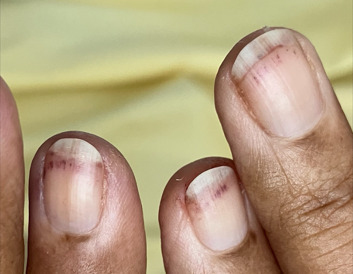 Quant au purpura fulminans, il s’agit d’une coagulation intravasculaire disséminée avec choc septique, qui s’accompagne souvent de plages de nécrose cutanée purpurique. Ce syndrome ne s’associe pas classiquement à des hémorragies sous-unguéales en flammèche.