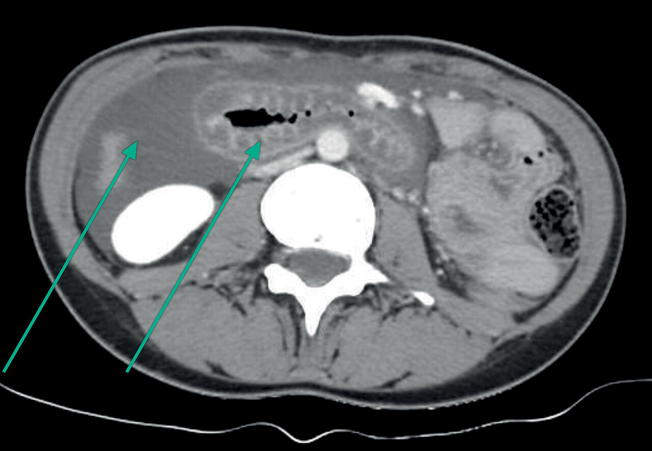 Une femme de 29 ans, sans antécédents, sous contraception orale depuis quelques mois, a des douleurs abdominales diffuses d’apparition brutale avec vomissements. Les analyses réalisées lors de la consultation aux urgences montrent des polynucléaires neutrophiles à 18 000/mm3 ; la protéine C réactive (CRP) est inférieure à 4 mg/L. Un scanner abdominal est réalisé.